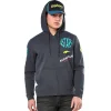 – Logotipos múltiplos na frente, mangas, costas e capuz.
